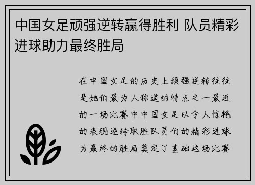 中国女足顽强逆转赢得胜利 队员精彩进球助力最终胜局