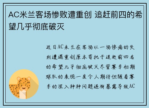 近日,AC米兰在客场以一场惨痛的失利遭遇重创,原本寄托于追赶前四名的希望几乎彻底破灭。尽管赛季初期,球队的表现一度令人期待,但随着赛季的深入,种种问题逐渐暴露,导致AC米兰的排名不断下滑。这场客场失利不仅仅是一次普通的失败,更是对球队士气、战术以及管理层的一次严峻考验。本文将从四个方面深入分析AC米...